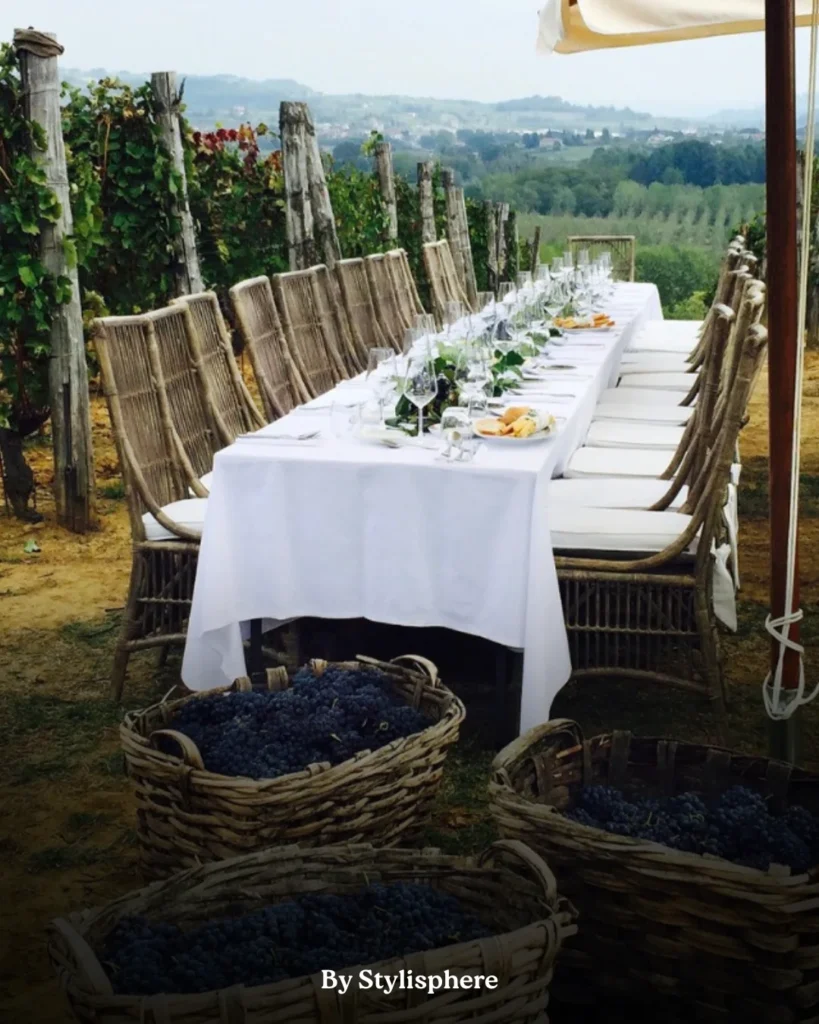 Vaktet shërbehen nën pergola të mbuluara me hardhi ose në sallën rustike prej guri, ku menuja thekson produktet sezonale, shijet tradicionale piemontese dhe verërat nga bodrumi i vilës, nga Barbera tek Nebbiolo.