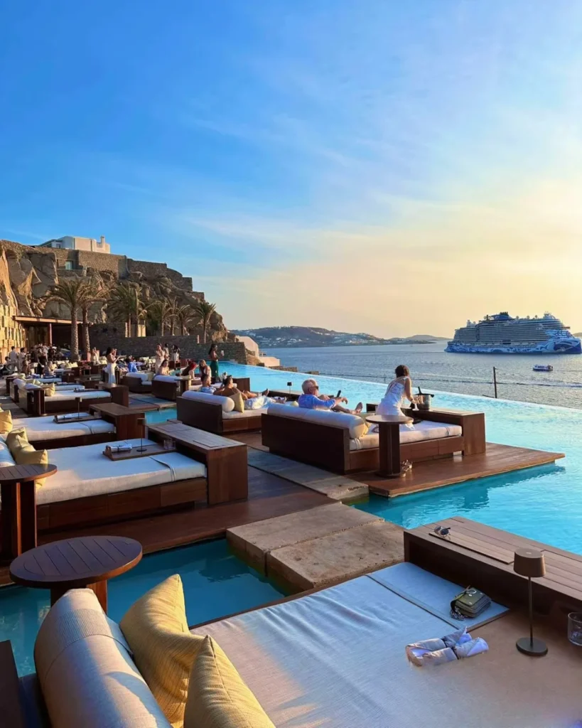 Një tarracë në lartësi mbi Egje, ku horizonti i Mykonos-it hapet i plotë drejt perëndimit.