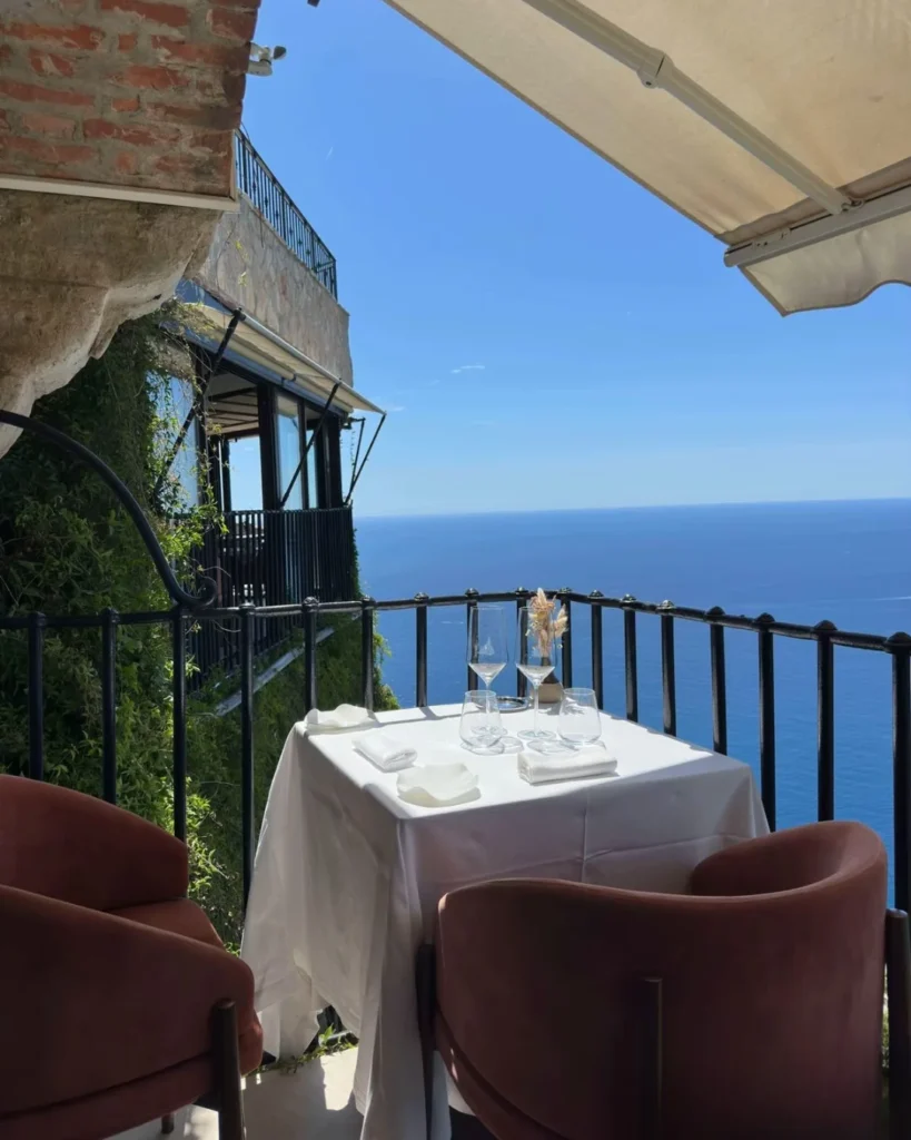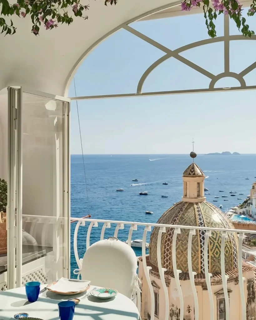 Një tarracë elegante në Le Sirenuse, me pamje të hapur mbi Positano dhe bregun e Amalfit.