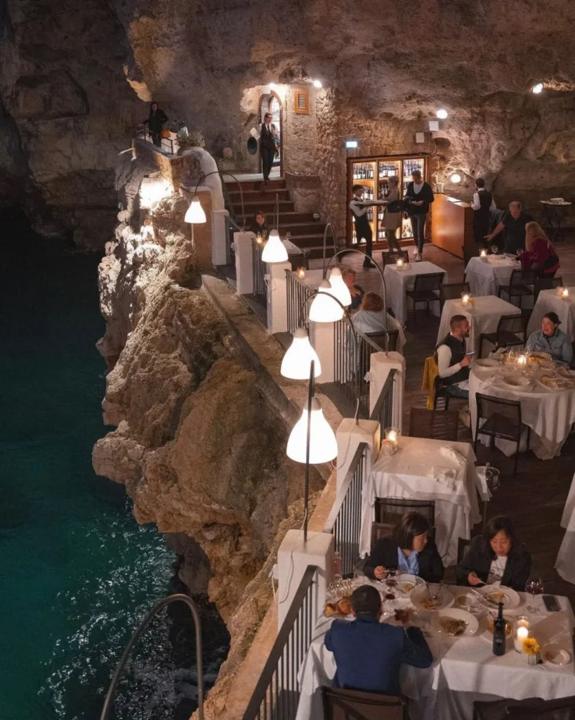 Një shpellë gëlqerore e hapur drejt detit Adriatik me tavan natyral të harkuar, e kthyer në restorant.