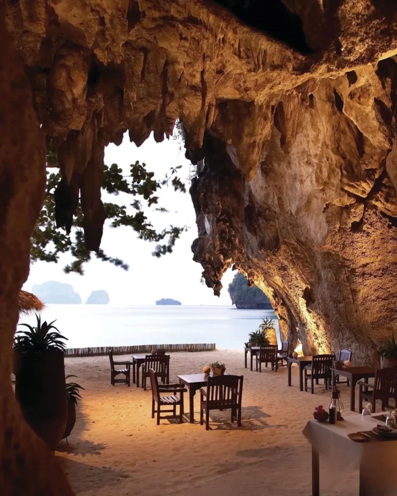 Një restorant i vendosur nën një formacion shkëmbor në Phra Nang Beach, me tavolina direkt mbi rërën e bardhë.