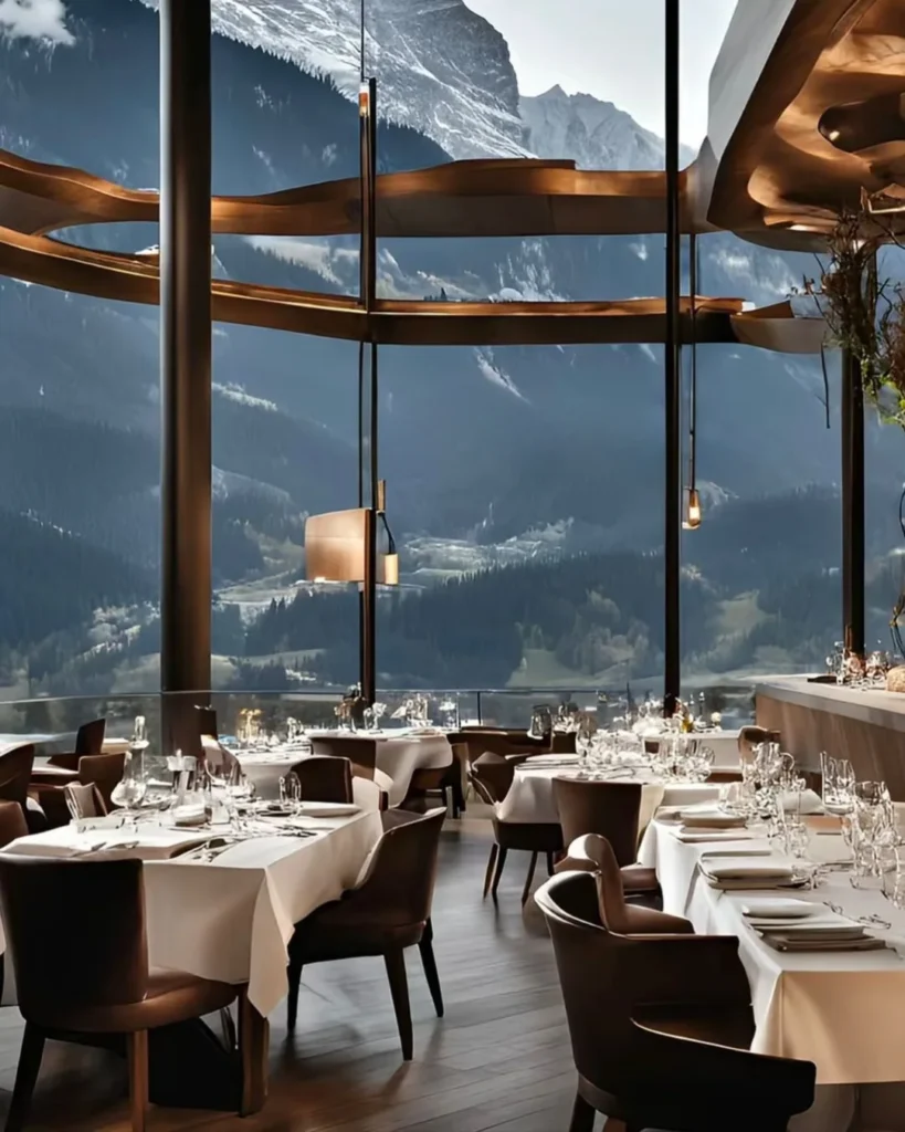 Restoranti i vendosur mbi një shkëmb në Zermatt, me dritare panoramike që hapen drejt Matterhorn-it dhe majave alpine përreth.